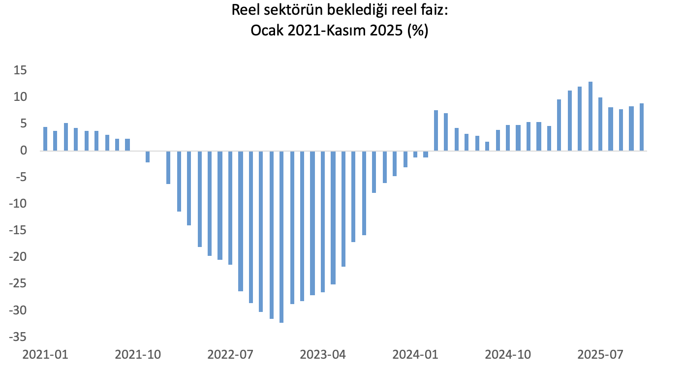 Şunu söylemeden edemeyeceğim: Bugün şikâyetçi olanlar, enflasyonu sıçratıp Türkiye’yi yüksek enflasyon liginde altıncılığa yükselten ve bugünkü politikalara yol açan uygulamalardan neden şikâyet etmediler? Grafikte Ocak 2021-Kasım 2025 arasında beklenen reel kredi faizinin seyri yer alıyor. Kredi faizinin herhangi bir aydaki değeri, şirketler kesiminin o ayda bir yıl sonrası için beklediği enflasyondan arındırılarak hesaplanıyor.