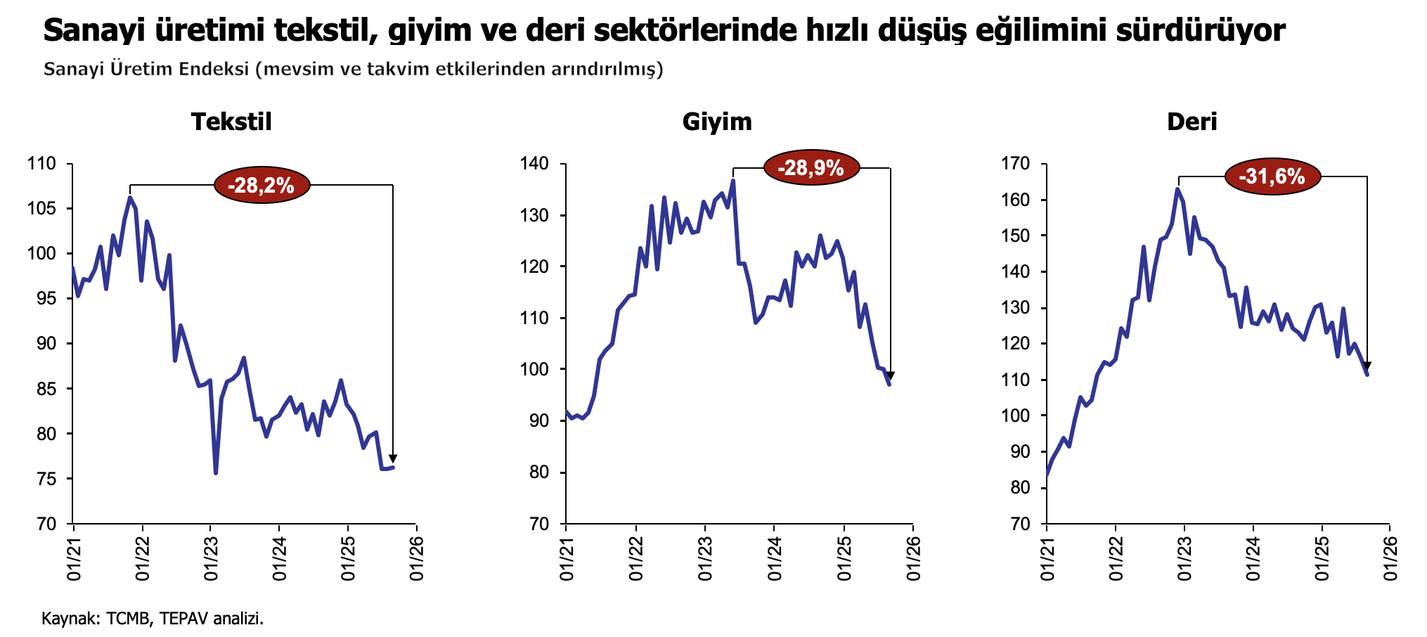 Öncelikle sanayi üretimi rakamlarına bakıldığında, emek yoğun sektörlerde bir gerileme olduğunu görmek mümkün. Eylül 2025 itibariyle, üretim; tekstilde Kasım 2021’e göre yüzde 28,2, giyim eşyasında Haziran 2023’e göre yüzde 28,9, deride ise Aralık 2022’ye göre yüzde 31,6 düşmüş durumda.