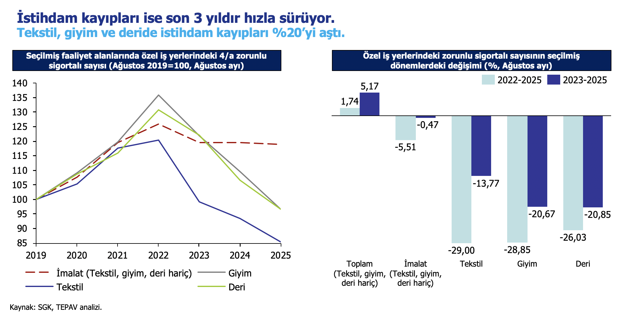 Bu üretim kayıpları elbette kayıtlı istihdam kayıpları ile birlikte gidiyor.Son üç yılda tekstil, hazır giyim ve deride istihdam kaybı yüzde 20’leri geçiyor Sosyal Güvenlik Kurumu (SGK) kayıtlarına göre. Ortada dikkate almamız gereken bir eğilim olduğu görülüyor, sanayi üretimindeki kayıplarla istihdam kayıplarına birlikte baktığımızda.