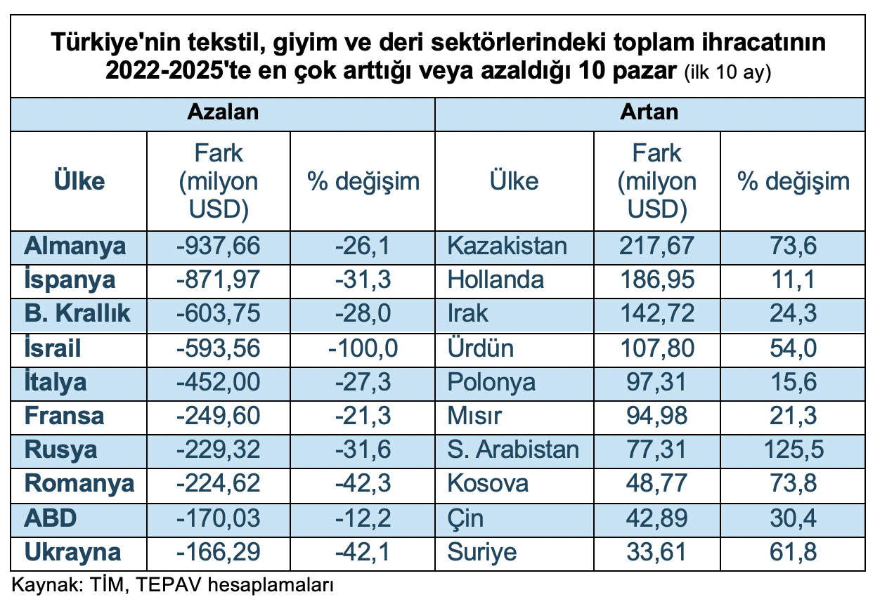 Yine son üç yıl için bakarsak tekstil, giyim ve deri sektörlerinin ihracatında da benzer bir gerileme dikkati çekiyor. 2022-2025 döneminde yüzde17,5’lik daralma (4,94 milyar USD) var. İhracattaki bu daralmanın 594 milyon USD'lik kısmı, yaklaşık yüzde 12’si, İsrail kaynaklı ama.