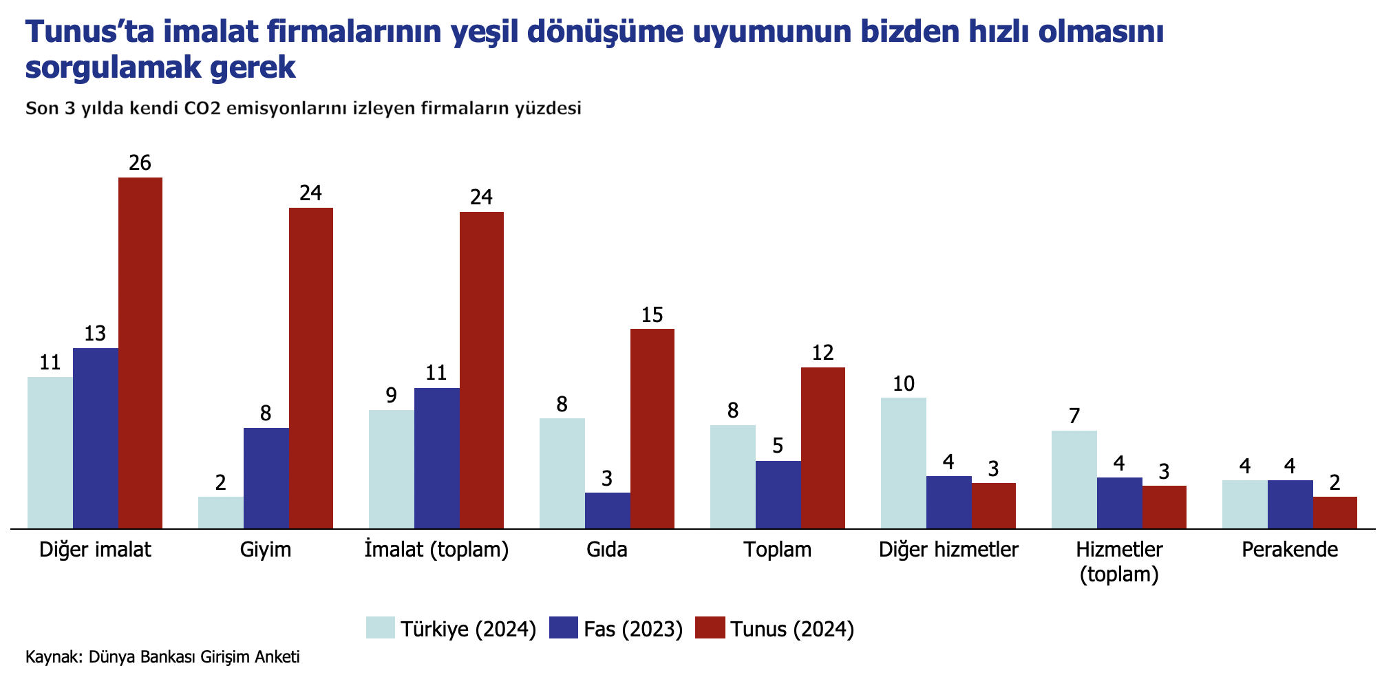 İsterseniz imalat sanayii firmalarının “son üç yılda karbon emisyonlarını takip etme” oranlarına da bakalım. Tunus’ta firmaların yüzde 23,5’i “son üç yıldır karbon emisyonlarını takip ediyorlar”, bu oran Fas’ta yüzde 8,8. Türkiye’de ise yüzde 7,5.