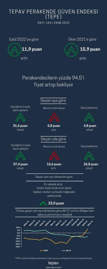 TEPE, Ekim 2022’de bir önceki aya göre 11,9 puanlık, bir önceki yılın aynı dönemine göre ise 15,9 puanlık artışla 6,8 puan değerini aldı. TEPE anketine katılan perakendecilerden geçtiğimiz 3 ayda işlerin durumunun iyileştiğini belirtenlerin oranı Ekim 2022’de yüzde 39,6’ya yükselirken, önümüzdeki 3 ayda işlerinde iyileşme bekleyenlerin oranı ise yüzde 11,2 seviyesinde kaldı. Önümüzdeki 3 ayda satış fiyatında artış bekleyen perakendecilerin oranı ise yüzde 94,5’e yükseldi. “Birden fazla türde ürün satan bakkal, market ve büyük mağazalar” sektörü Ekim ayında perakende güveni en fazla artan sektör oldu. Bölgeler bazında incelendiğinde ise Ekim ayı perakende güveninde en fazla artış Ortadoğu Anadolu Bölgesi’nde görüldü.