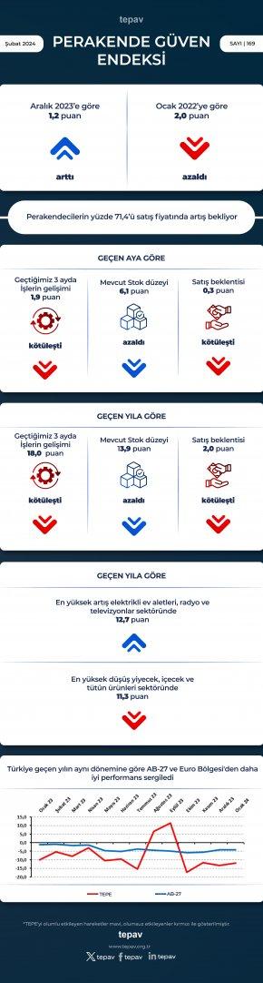 TEPAV Perakende Güven Endeksi (TEPE), Ocak ayında bir önceki yılın aynı dönemine göre 2,0 puanlık azalış ve bir önceki aya göre 1,3 puanlık artışla -11,9 puan değerine ulaştı. Anket katılımcılarından elde edilen verilere göre, perakendecilerin yüzde 71,4'ü önümüzdeki 3 ayda satış fiyatlarında artış bekliyor.