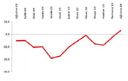 ANKARA- TEPE, Mayıs 2008'den bu yana ilk defa pozitife geçerek Ağustos 2010'da 3,2 değerini aldı. TEPE bir önceki aya göre 5,7 puan, bir önceki yılın aynı dönemine göre ise 8,3 puan arttı.