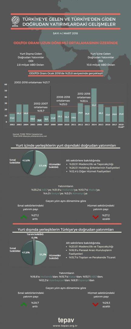 Doğrudan yatırımların yurt içi hâsılaya (GSYİH) oranına 2006-2016 dönemi itibarıyla bakıldığında, FDI/GSYİH oranının %3,7’den %1,6’ya düştüğü, ODI/GSYİH oranının ise %0,2’den %0,4’e yükseldiği görülmektedir.