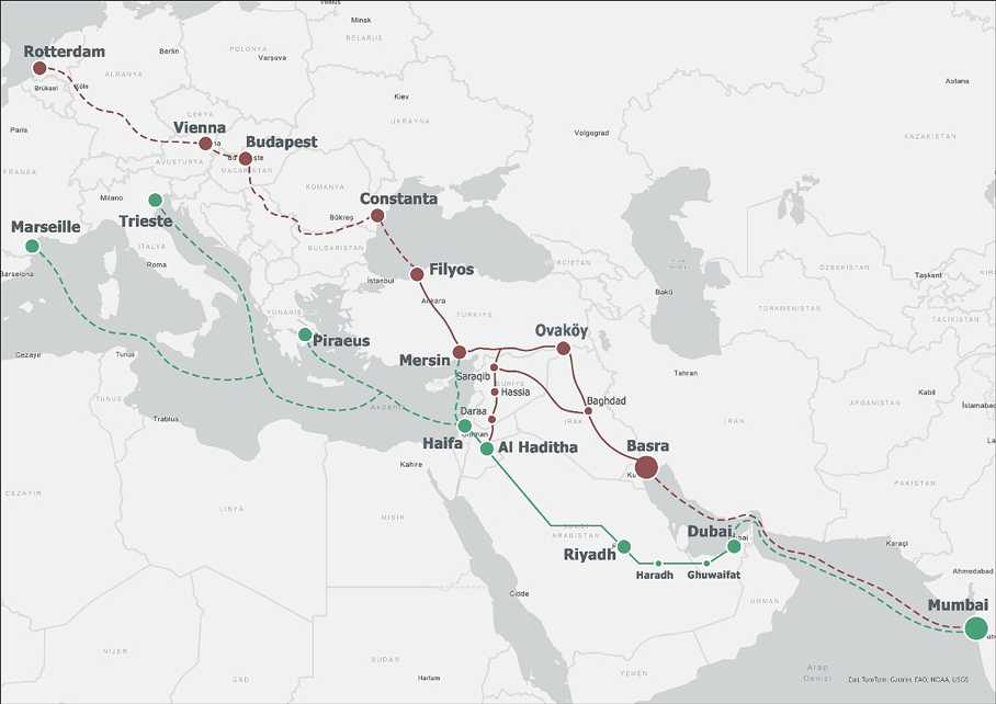 Türkiye o süreçte yoktu. Çünkü o günkü çizimlerde koridor Türkiye üzerinden geçmiyordu. Hindistan’dan gelip Körfez’e ulaşıyor, Suudi Arabistan, Ürdün üzerinden İsrail’in Hayfa limanına ulaşıyordu. Avrupa bağlantısı ise Hayfa üzerinden sağlanıyordu. Yalnızca liman ve elektrikli tren bağlantısı değil, boru hatlarını da içeriyordu ortadaki proje hattı.
