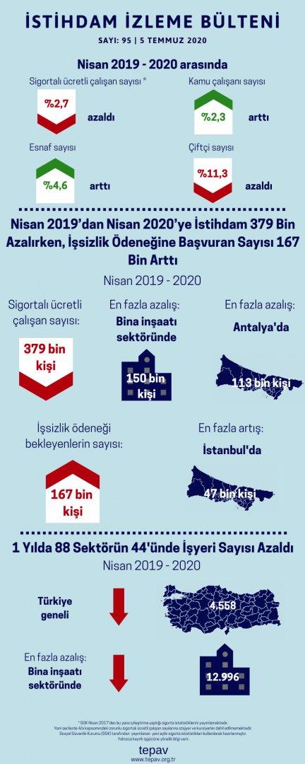 Sosyal Güvenlik Kurumu (SGK) ve Türkiye İş Kurumu (İŞKUR) Nisan 2020 verilerinin değerlendirildiği TEPAV İstihdam İzleme Bülteni’nin 95. Sayısında, 4/a sigortalı çalışan sayısı Nisan 2020’de Nisan 2019’a göre 379 bin azalırken, işsizlik sigortasına başvuranların sayısı 167 bin arttı.