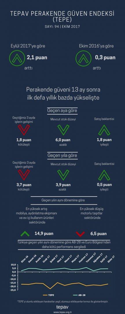 Perakende güveni Ekim ayında -16,6 puan değerini aldı. Endeks, bir önceki aya göre 2,1 puan, bir önceki yılın aynı dönemine göre ise 0,3 puanlık bir yükseliş kaydetti. Böylelikle Eylül 2016’dan bu yana yıllık değişimde ilk defa artış yaşayan TEPE, Ekim 2017’de Ekim 2016 seviyesini (-16,9) yakalamış oldu. Yıllık artışın sınırlı kalmasında geçtiğimiz 3 ayda işlerin gelişimindeki düşüş etkili oldu. “Mobilya, aydınlatma ekipmanı ve ev içi kullanım ürünleri” sektörü, Ekim ayında perakende güveninde en çok artış gösteren sektör oldu. AB-28 ve Euro Bölgesi ile karşılaştırıldığında Türkiye geçen yıla göre daha kötü performans sergiledi.